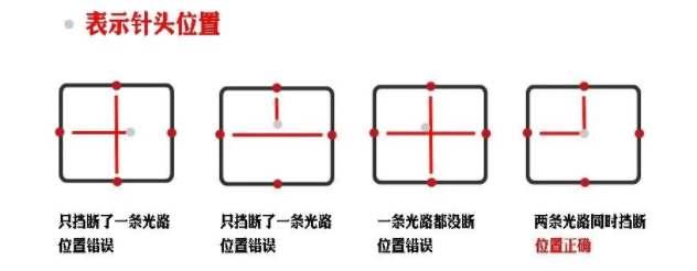 當(dāng)針嘴在檢測區(qū)域內(nèi),每次都按照相同的運(yùn)動方向移動,每次都剛好擋斷2條光路,此時(shí)兩個(gè)傳感器同時(shí)輸出信號,可以判斷針嘴在正確的水平位置,實(shí)現(xiàn)XY軸對針效果。
