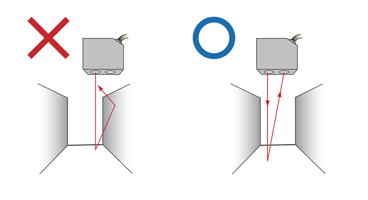 感應(yīng)頭周圍存在壁面時(shí),投射激光經(jīng)過壁面反射回的亂光會(huì)導(dǎo)致測量的偏差。若安裝環(huán)境限制使得傳感器必須緊挨著壁面安裝時(shí),請將傳感器的投光光軸和受光光軸構(gòu)成的平面平行于壁面。且將壁面處理為低反射率的黑色表面,以降低壁面的反射光量。