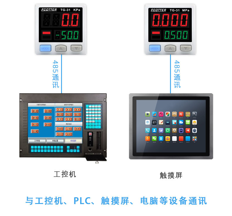 ECOTTER 通訊款485壓力開關(guān)可以傳輸氣壓數(shù)據(jù)給到系統(tǒng)進(jìn)行分析使用,可以與工控機(jī)、觸摸屏等設(shè)備互動(dòng),執(zhí)行命令、顯示數(shù)據(jù)到連接屏上。可以實(shí)現(xiàn)自動(dòng)化更智能的控制及管理。