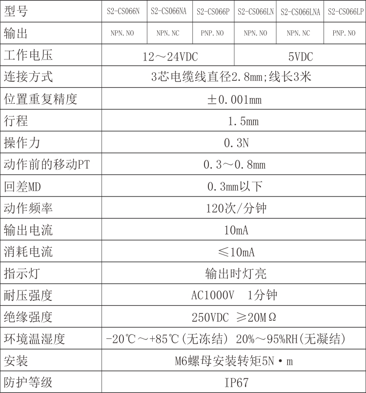 S2-CS066系列操作力非常小,僅0.3N的力即可操作。動作前的移動PT是0.3~0.8毫米,行程1.5毫米。信號輸出時,在機身尾部有信號指示燈亮起。