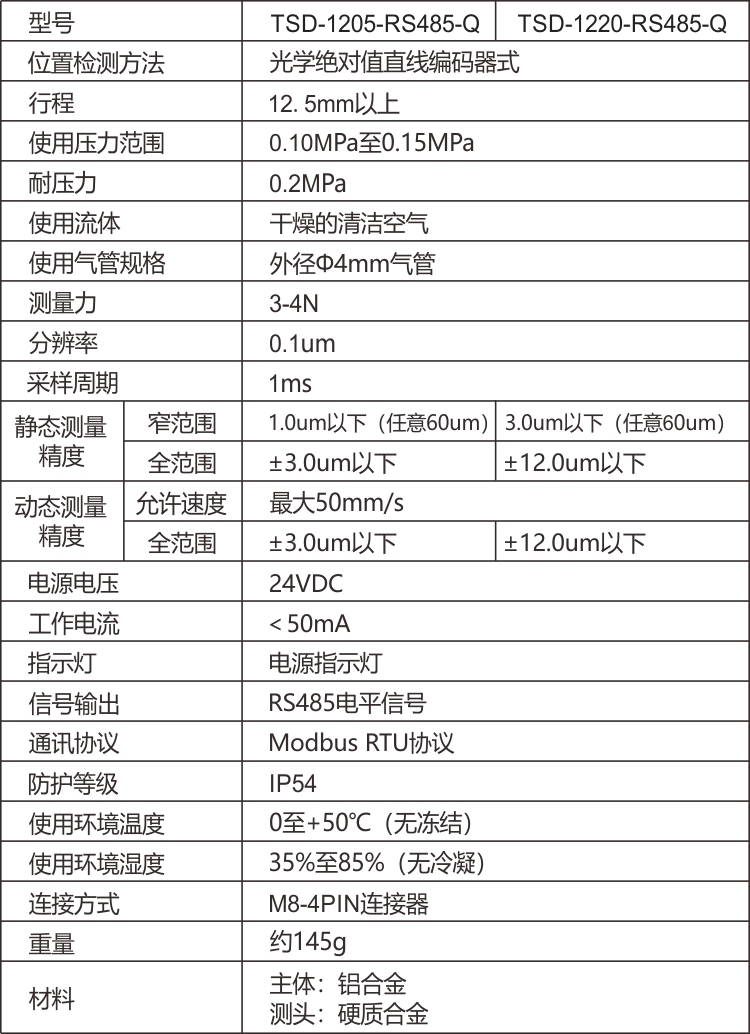 TSD-1205-RS485-Q為氣動型,由氣管接口可接直徑4mm氣管,通0.12~0.17mpa氣壓推出探桿,測量精度可達3um。支持RS485 modbus rtu ,可高速返回數(shù)據(jù)每秒1000次,實現(xiàn)動態(tài)測量。